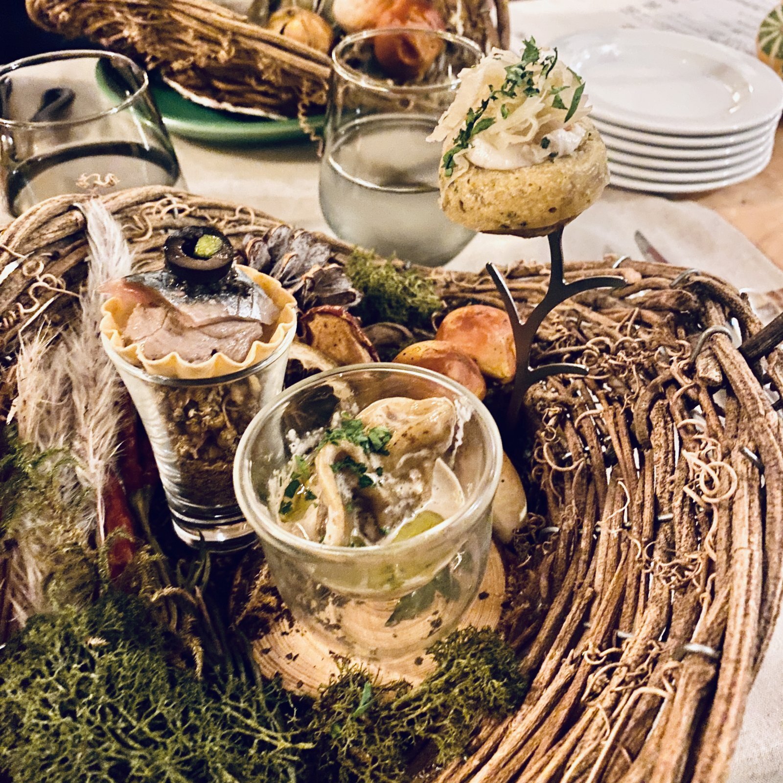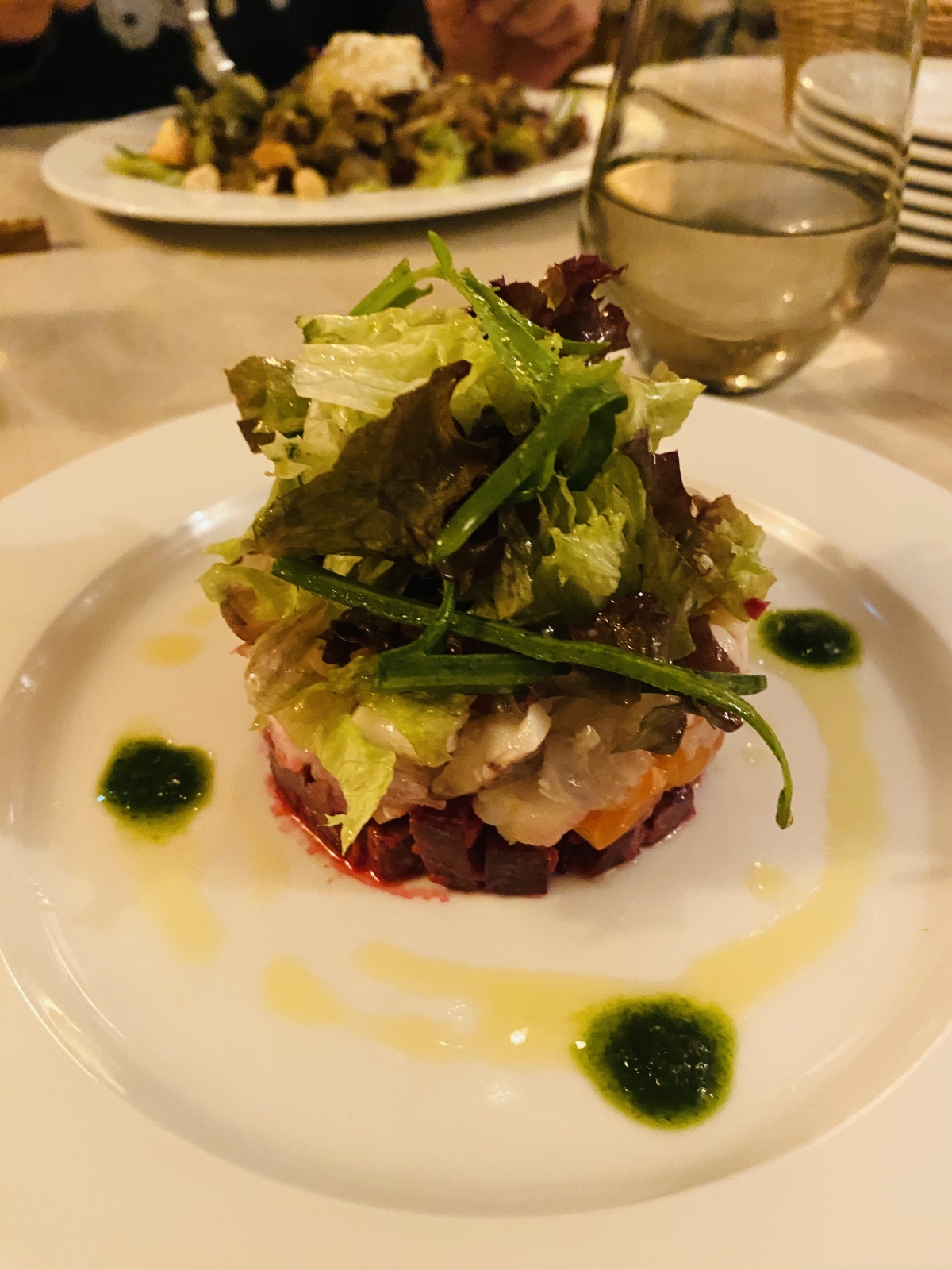 一番下はビーツのマリネ、その上に魚介のマリネ