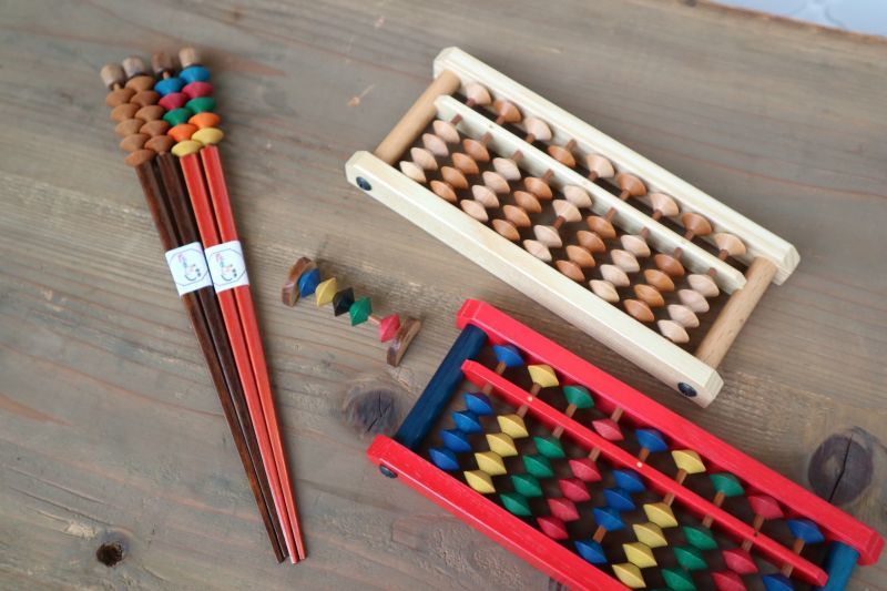 ▲播州そろばんのお箸と箸置きもあり、もちろん玉も動きます